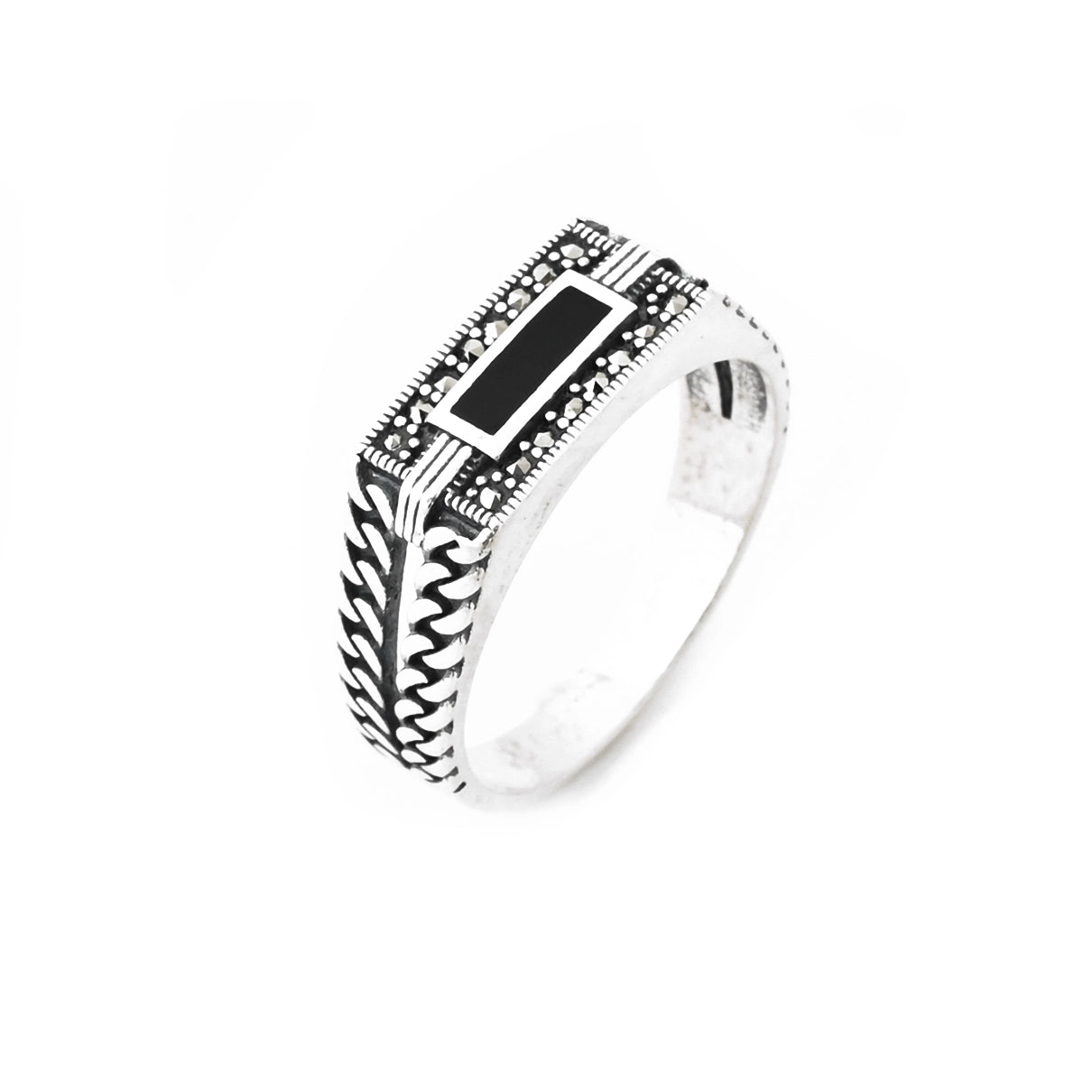خاتم رجالي فضة مأكسد عيار 925 بأحجار ماركزت ومينا سوداء وجه مستطيل بسيط كلاسيك وكاجوال BMR0100437