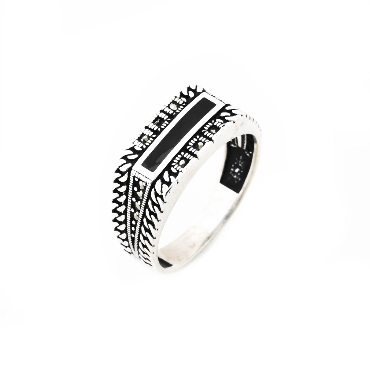 خاتم رجالي فضة مأكسد عيار 925 بأحجار ماركزت ومينا سوداء وجه مستطيل بسيط كلاسيك وكاجوال BMR010413