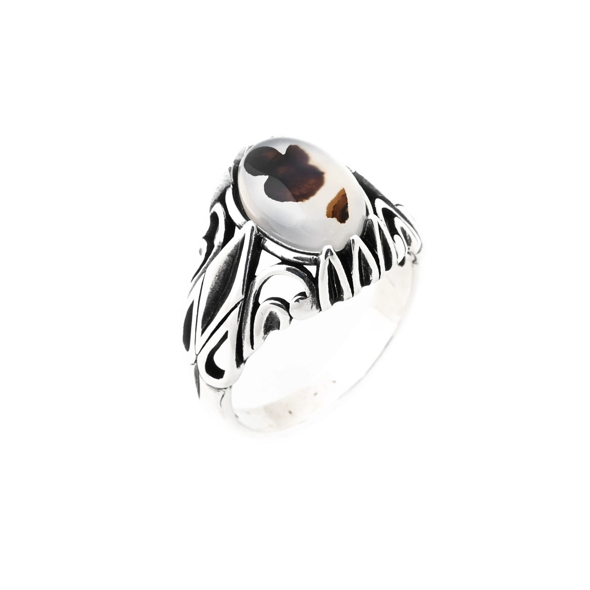 خاتم رجالي فضة مأكسد عيار 925 بحجر عقيق طحلبي ومفرغ بالجانبين BMR0100929