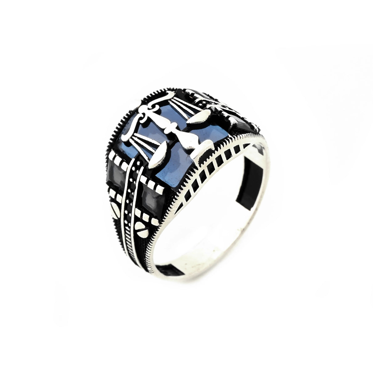 خاتم رجالي فضة مأكسد عيار 925 ميزان العدالة بحجر ازرق بالخلفية واحجار الزركون الاسود بالجانبين BMR0100561
