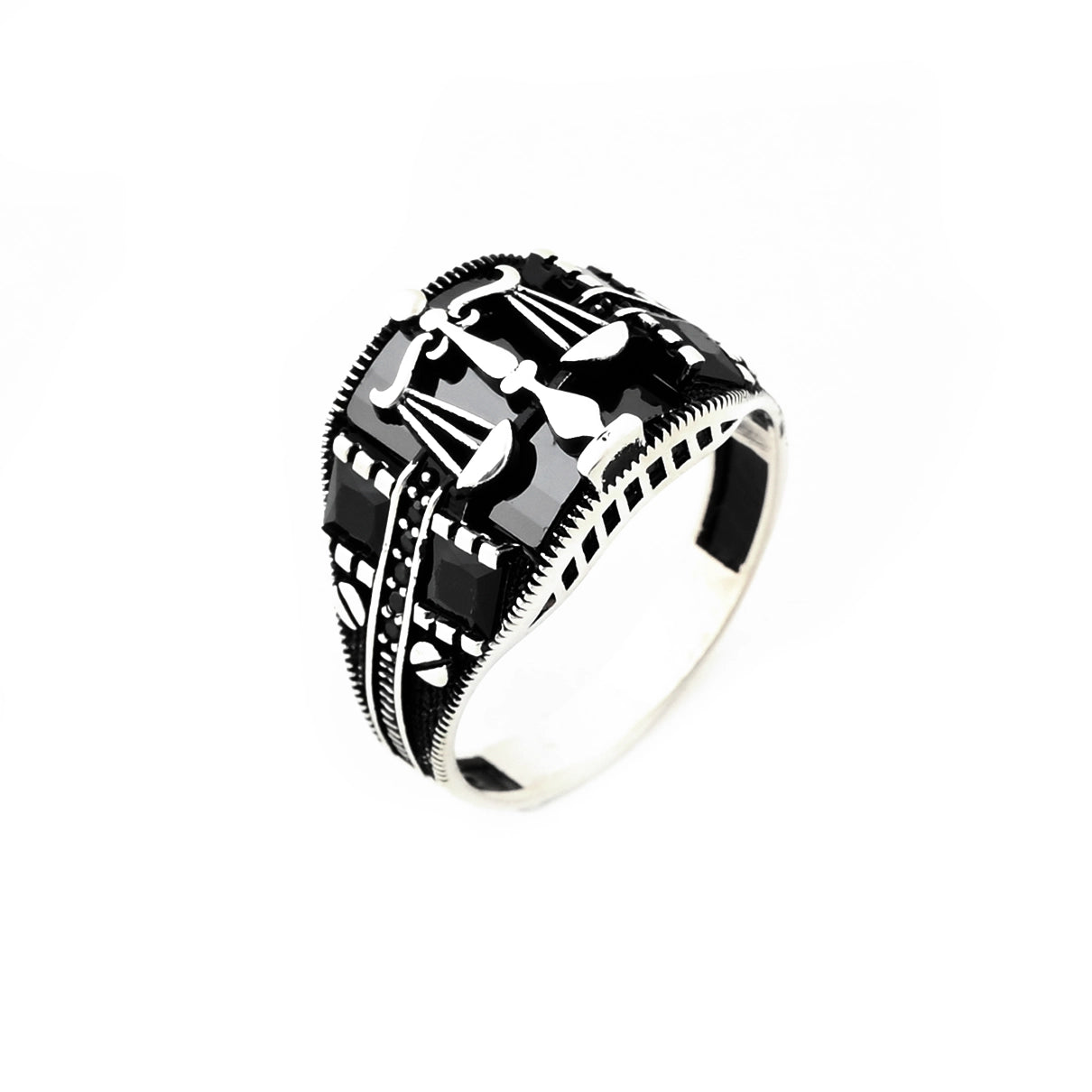 خاتم رجالي فضة مأكسد عيار 925 ميزان العدالة بحجر اسود بالخلفية واحجار الزركون الاسود بالجانبين BMR01000700